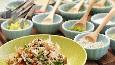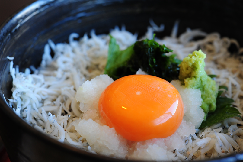 茨城納豆にシラス・とろろ芋・昆布・しその実等の具材10種とタレ4種からお好きなものをまぜまぜしてご賞味ください。