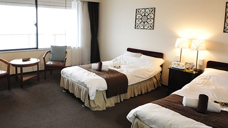 大きな窓からは、太平洋常陸灘の水平線、夜はライトアップされる磯原海岸のシンボル「二ツ島」が直ぐ目の前に見え、ベッドや布団に寝転ぶと、まるで海の上にいるように感じる事ができます。
